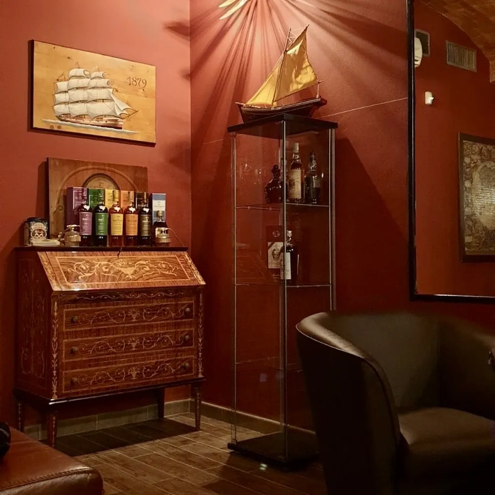 L’ambiente è classico Speakeasy. Locale piccolino ma è giusto che sia così. Sedute in pelle, comode e ampie. Bancone vecchio stile con una quantità di bottiglie da far emozionare. In giro per il locale ci sono credenze e mobili che contengono, indovinate un pò….altre bottiglie. Si parla di una collezione di circa 300 bottiglie, in continuo aggiornamento.