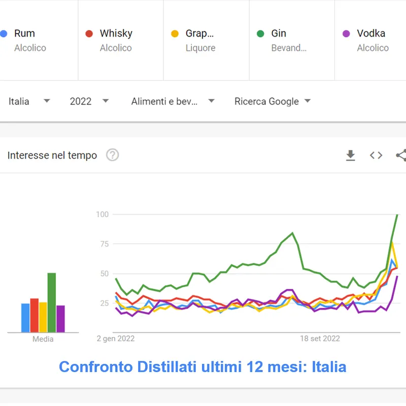 Particolari gli andamenti mensili. Picco nella settimana di ferragosto per il Gin che conferma e sorpassa questo picco di ricerche nel mese di Dicembre, in particolare nel periodo prima di Natale fino a fine anno. Andamento simile (ma con valori diversi) per la Vodka. Grappa, Whisky e Rum hanno avuto invece un calo nella settimana post Natalizia.