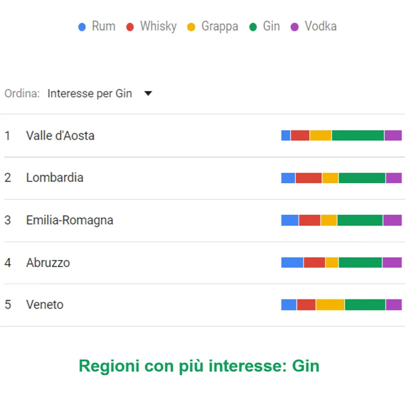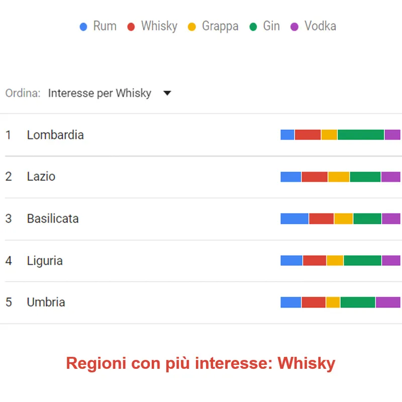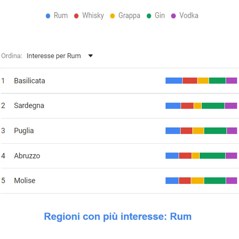 Sul terzo gradito del podio ritroviamo la Basilicata, secondo posto per il Lazio, primo posto per la Lombardia. Percentuali sopra il 20%. Valle D’Aosta, Veneto e Friuli chiudono la classifica con percentuali vicine al 15%. A differenza del Rum, si vede subito come la % di ricerca tra le prime e le ultime è “minima”.