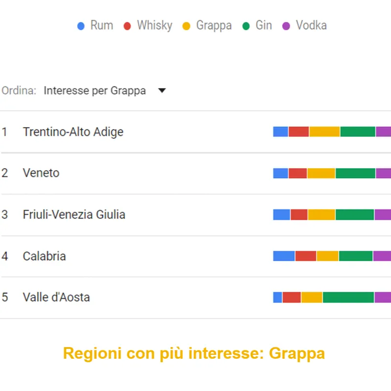 Il centro sud si conferma amante di questo distillato. Basilicata, Sardegna e Puglia occupano il podio con percentuali superiori al 20% di ricerche. Abruzzo e Molise chiudono la Top 5. Veneto, Lombardia e Valle D’Aosta sono invece le regioni con meno ricerche (intorno al 10%)