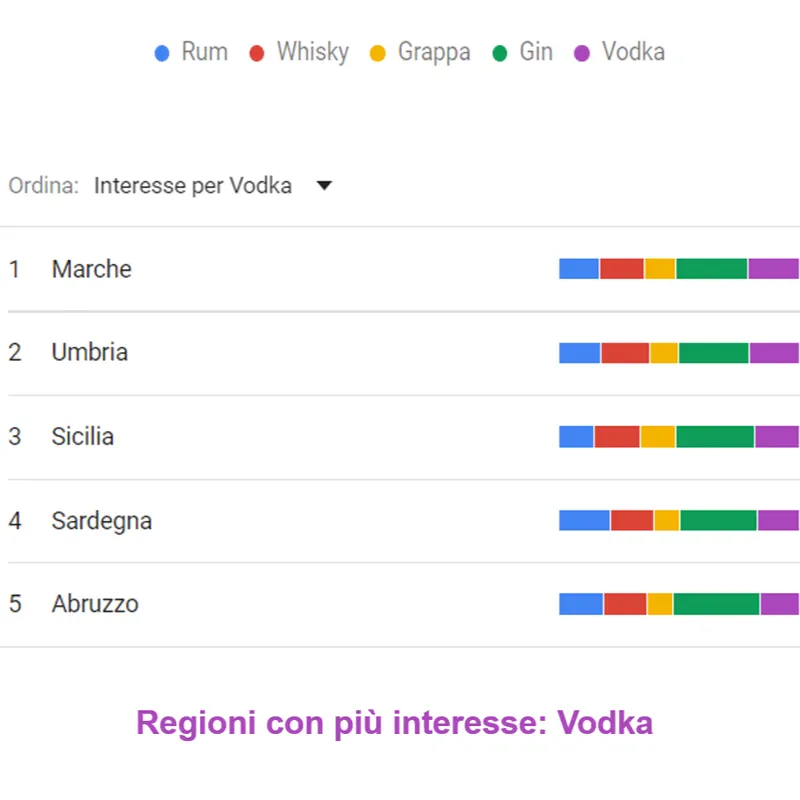 Marche, Umbria e Sicilia sono i luoghi dove ancora si beve molta Vodka: tra il 18% ed il 21% di ricerche. Lombardia, Trentino e Veneto chiudono la classifica (13%).