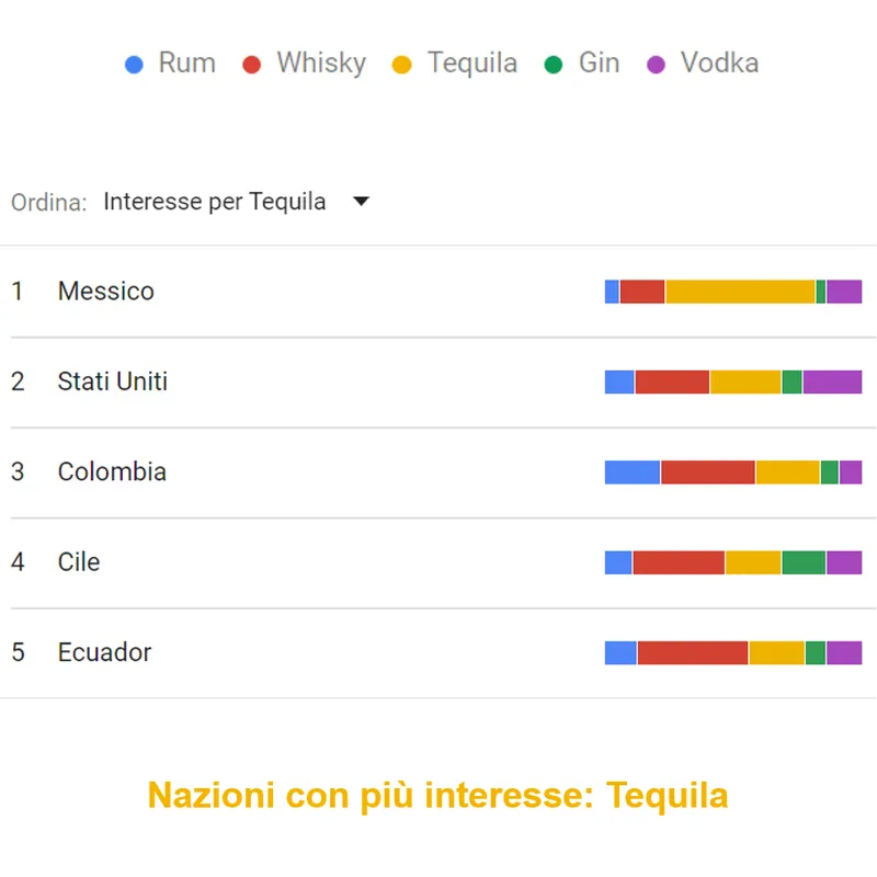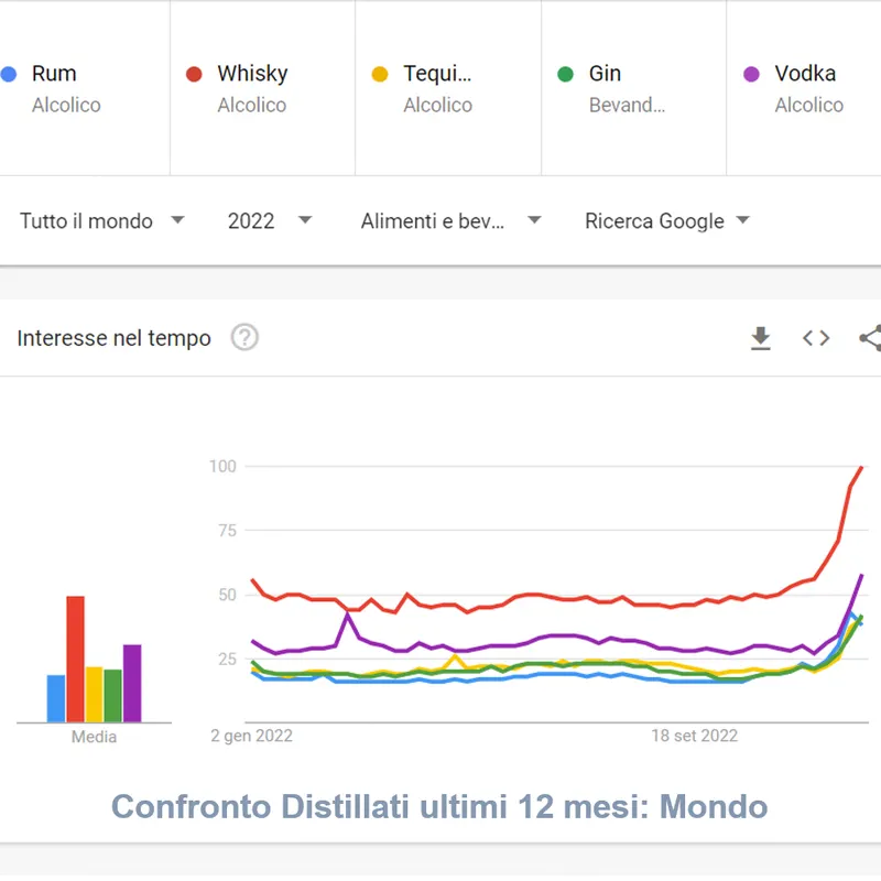 Rispetto al mercato italiano, dove il Gin la faceva da padrone, in ambito mondiale è il Whisky a viaggiare quasi al doppio delle ricerche degli altri distillati.