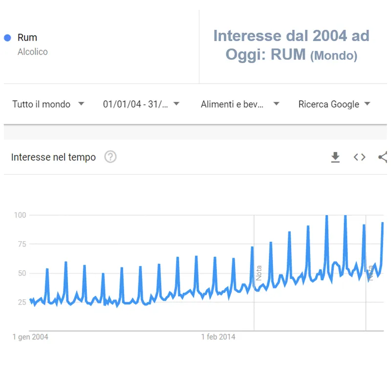 Partiamo dando un occhio al trend delle ricerche dal 2004 ad oggi, per quanto riguarda il Rum. Come già visto nel nostro mercato interno, la crescita c’è ma si sta leggermente appiattendo negli ultimi anni.