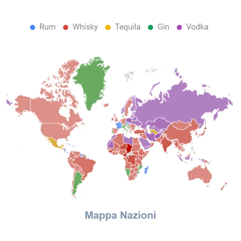 I Distillati più diffusi nel Mondo: dopo l’Italia, andiamo a vedere cosa è successo nel Mondo. Valgono le stesse considerazioni per il report Italia 2022. Guardando la mappa, si capisce fin da subito che la situazione nel Mondo è ben diversa rispetto a quella riscontrata in Italia. Ma andiamo per gradi. Prima nota: abbiamo sostituito la Grappa (molto ricercata in Italia) con il Tequila (a livello mondiale ha un’incidenza molto superiore).