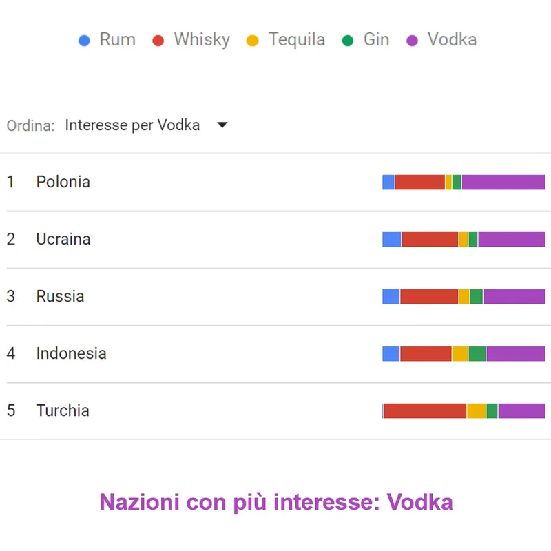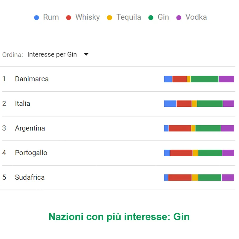 Analizziamo la situazione Nazione per Nazione, nelle immagini sotto trovate uno spaccato per singolo distillato. Non abbiamo inserito le Nazioni a basso volume di ricerca, quindi è normale non trovare Paesi come Martinica, Guadalupa, Giamaica, ecc… tra le top Nazioni del Rum. Per darvi un’idea, in Martinica l’88% delle ricerche è sul Rum, il Gin ha un volume di ricerca inferiore all’1%.  L’isola di Mayotte, a nord ovest del Madagascar, ha il 100% di ricerche sul Rum, sembrano non esistere gli altri distillati.