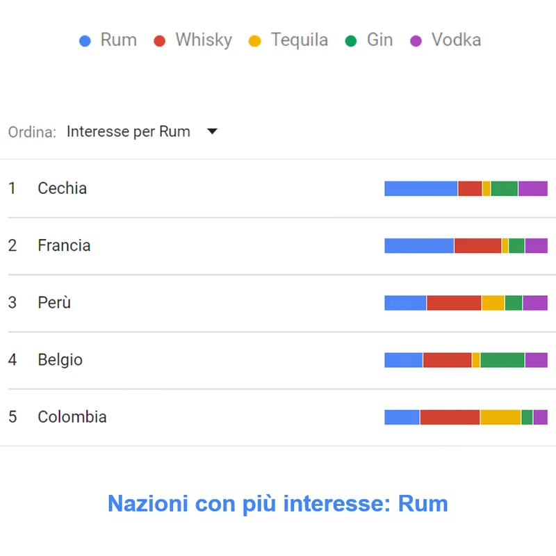 Si conferma la Repubblica Ceca la Nazione a più alto volume di ricerca per quanto riguarda il Rum (46%). Francia al secondo posto  (43%), più staccati Perù (26%) Belgio (24%) e Colombia (21%). Fanalino di coda la Turchia (1%). Tra le ultime posizione troviamo anche il Brasile, dove il Rum è completamente sostituito dalla Cachaça che come sappiamo è pur sempre un distillato derivato dalla Canna da Zucchero.